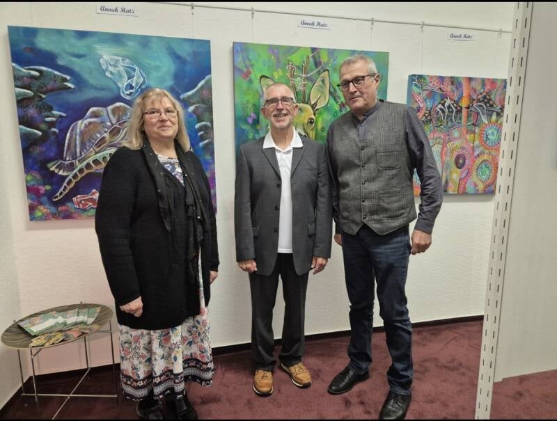 Elena Etzel und Johannes Schweiger mit dem katholischen Dekan von Baden-Baden Lorenz Seiser bei einer Vernissage.